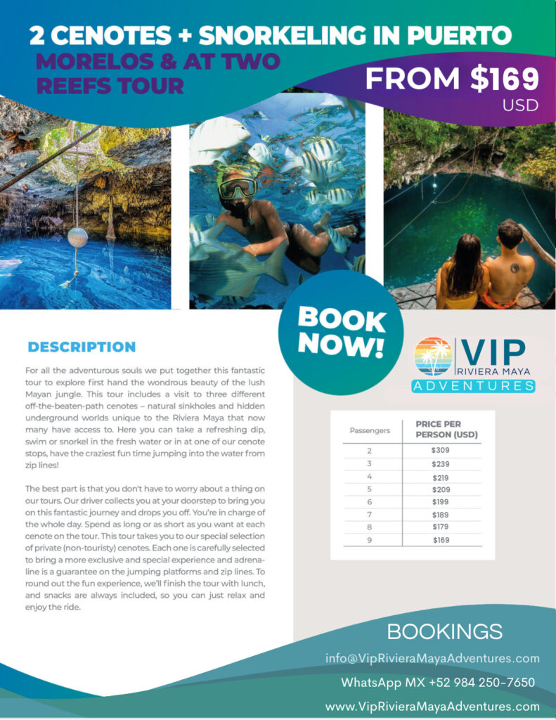 Forget cookie-cutter tours! VIP Riviera Maya Adventures crafts your ultimate personalized jungle-to-ocean odyssey. Experience three secret cenotes + vibrant reef snorkeling in Puerto Morelosāall in one epic, freedom-filled day. Zero schedules. Zero crowds. Pure magic.