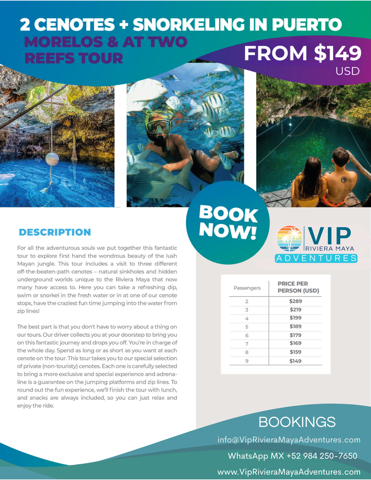 Swim, snorkel, or soar into crystalline waters via ziplines & jump platforms at exclusive, private cenotesāno tourist hordes, just you and paradise.**š SNORKEL TWO THRIVING REEFS: