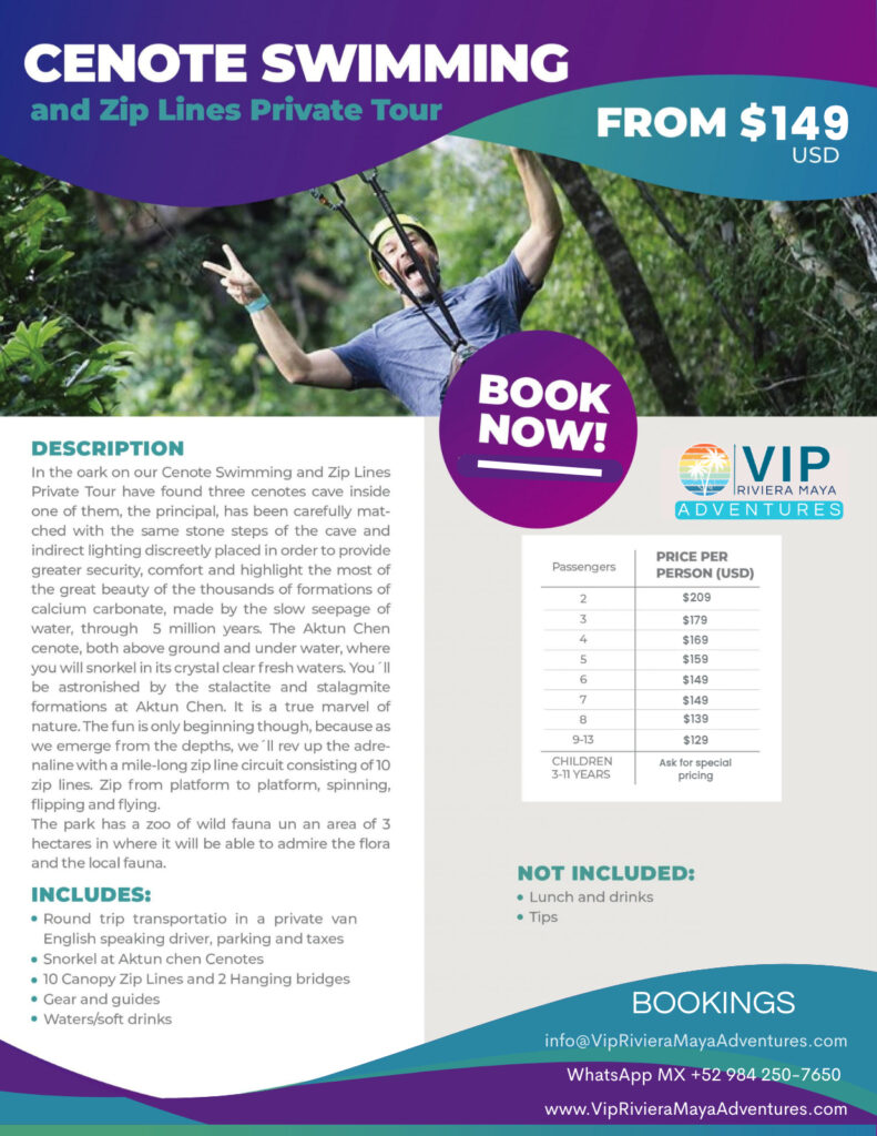 Trade ordinary tours for an UNFORGETTABLE duel with nature! VIP Riviera Maya Adventures delivers your private passport to Aktun Chenâs mystical underworld and a mile-long zip line circuitâwhere ancient cave wonders collide with adrenaline-pumping flight. No crowds. No compromises. Just pure, unfiltered magic.