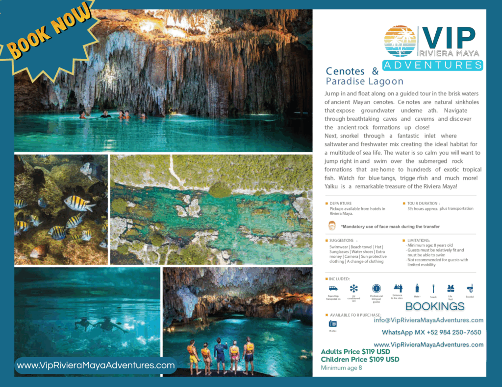 Jump in and float along on a guided tour in the brisk waters of ancient Mayan cenotes. cenotes are natural sinkholes that expose grandwater underneath. Navigate through breathtaking caves and caverns and discover an ancient rock formation up close! Next, snorkel through the fantastic inlet where saltwater and freshwater mix creating the ideal habitat for a multitude of sea life.