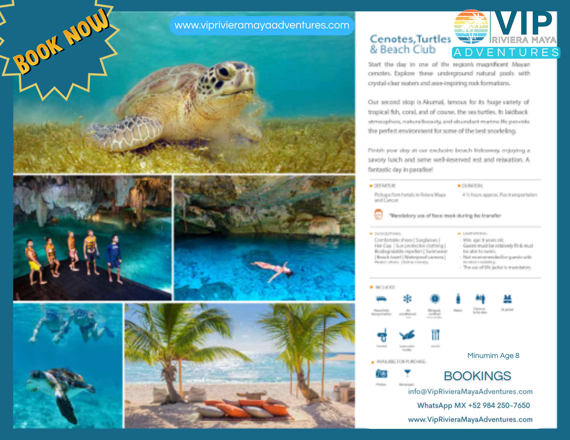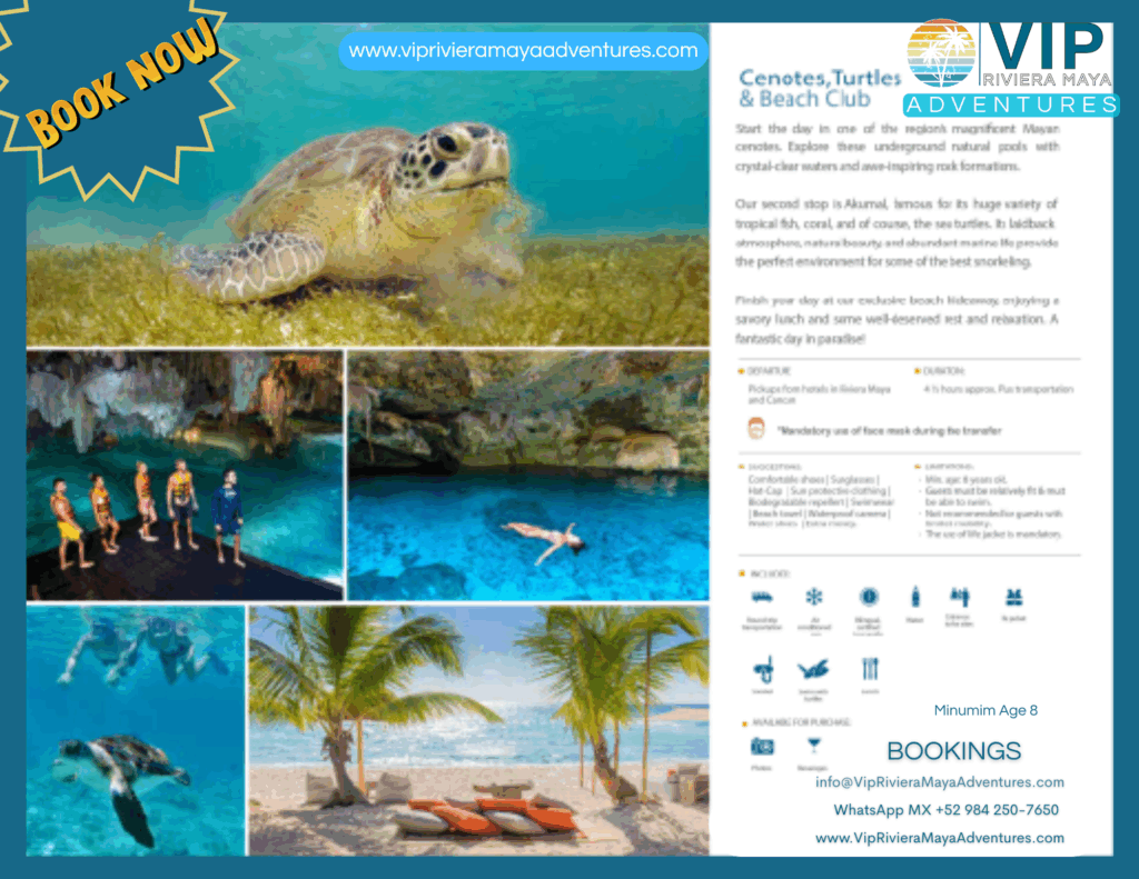 Ā ALL FEES INCLUDED:Ā Cenote entry, turtle snorkeling gear, beach club access, lunch & drinks