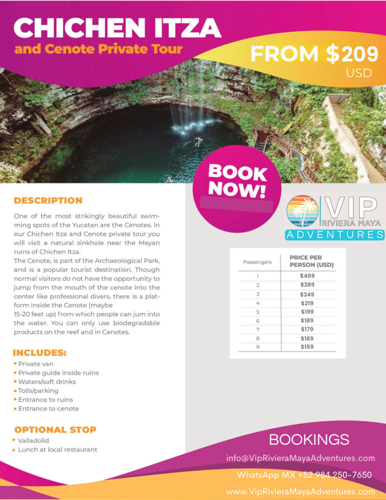 One of the most beautiful swimming spots of the Yucatan are the Cenotes. In our tour Chichen Itza and Cenote private tour you will visit a natural sinkhole near the Mayan ruins of Chichen Itza.