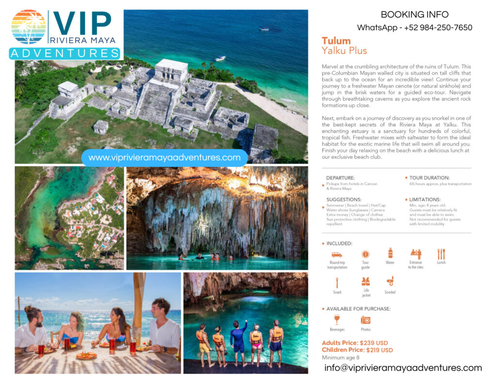 Trade ordinary for EXTRAORDINARY! VIP Riviera Maya Adventures propels you through Tulumâs cliffside citadel, into sacred cenote caverns, and finally to Yalkuâs secret fish sanctuaryâwhere history, adrenaline, and liquid magic collide. This isnât a tour⌠itâs your all-access pass to the Riviera Mayaâs soul.